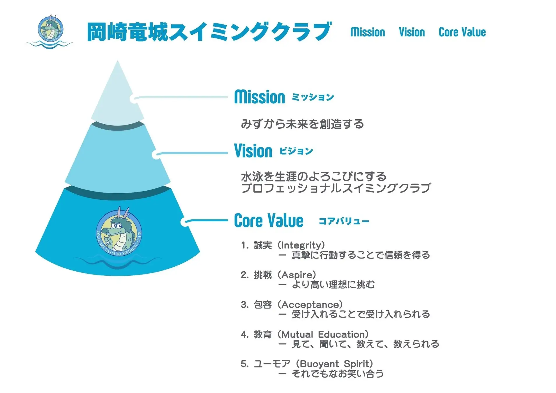コアバリューは創業者の精神をもとに整理し、ミッションとビジョンはこれからの岡崎竜城スイミングクラブの未来を表す言葉として定めています。