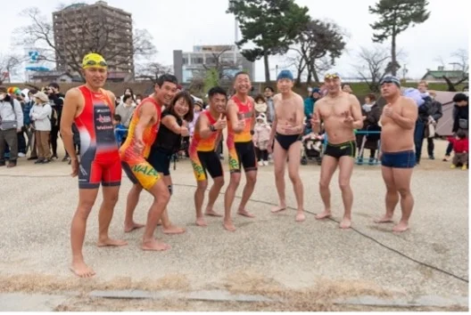 ・参加者の声:「思った以上に冷たかったが泳げてよかった」「水に入った後の味噌汁が最高においしい」「若者に負けず泳ぎ切れてよかった!」「トライアスロンチームで2年連続参加しました。来年もぜひ参加したい!」「はじめて参加しました。身を引き締めて今年一年頑張ります!」など
